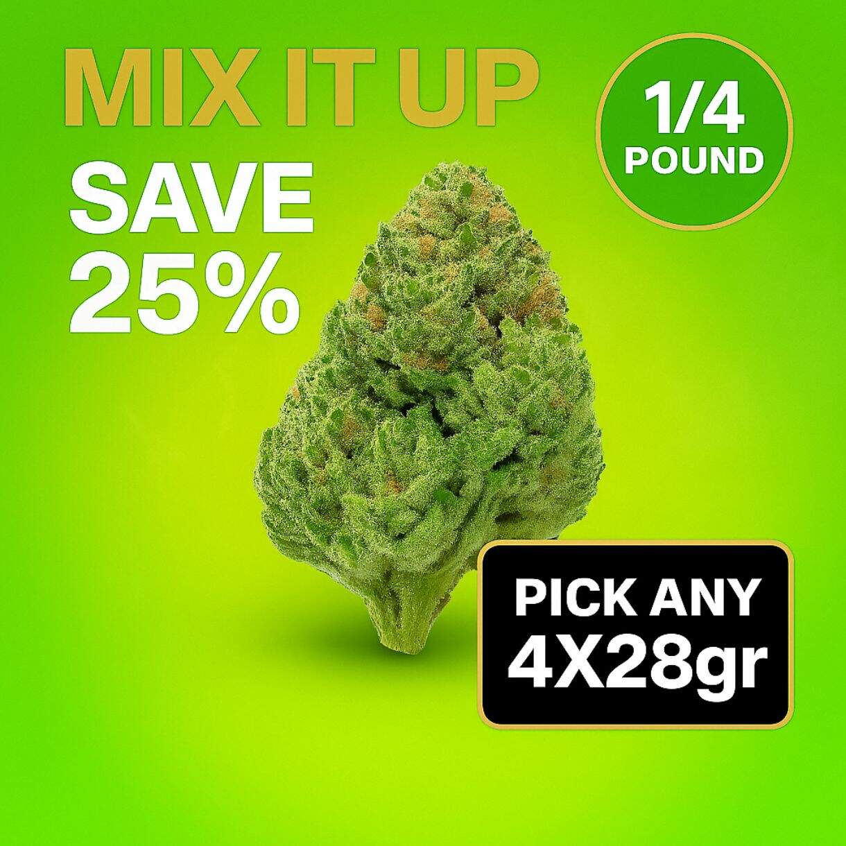 Picture this: you, the cannabis connoisseur, getting to pick any 4 units of 28 grams each from our curated selection of top-notch flower. It’s like having your own green utopia with the freedom to explore different flavors, aromas, and effects – all while saving a whopping 25%! Yes, you read that right – this deal is the real green deal.